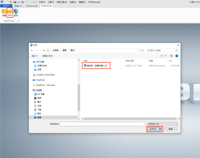 3.打开工程用IROBOTCAM下的“打开”菜单,选择.Z3文件,否则不会加载已创建的机电建模数据