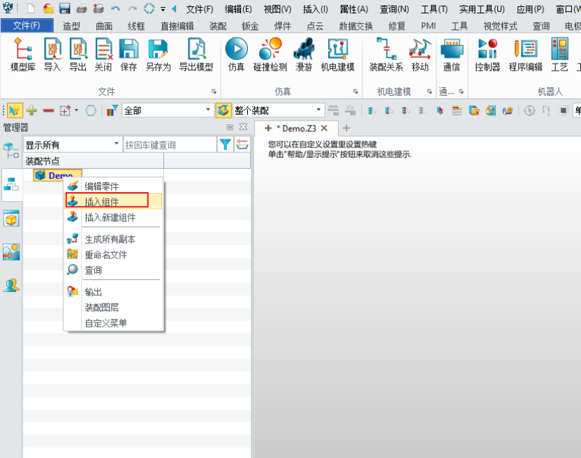 新建工程后,在装配右键,选择插入组件,或者新建零件再插入组件: