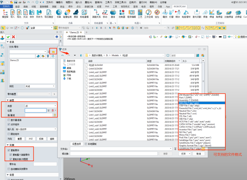 插入组件界面:点击文件夹图标,设置组件放置位置,勾选复制零件,选择导入的零件格式,如STEP,SLDPRT等格式