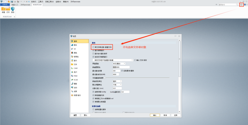 1.新建工程:IROBOTCAM需要在.Z3格式的工程中操作,创建工程前,需要设置取消“单文件单对象”