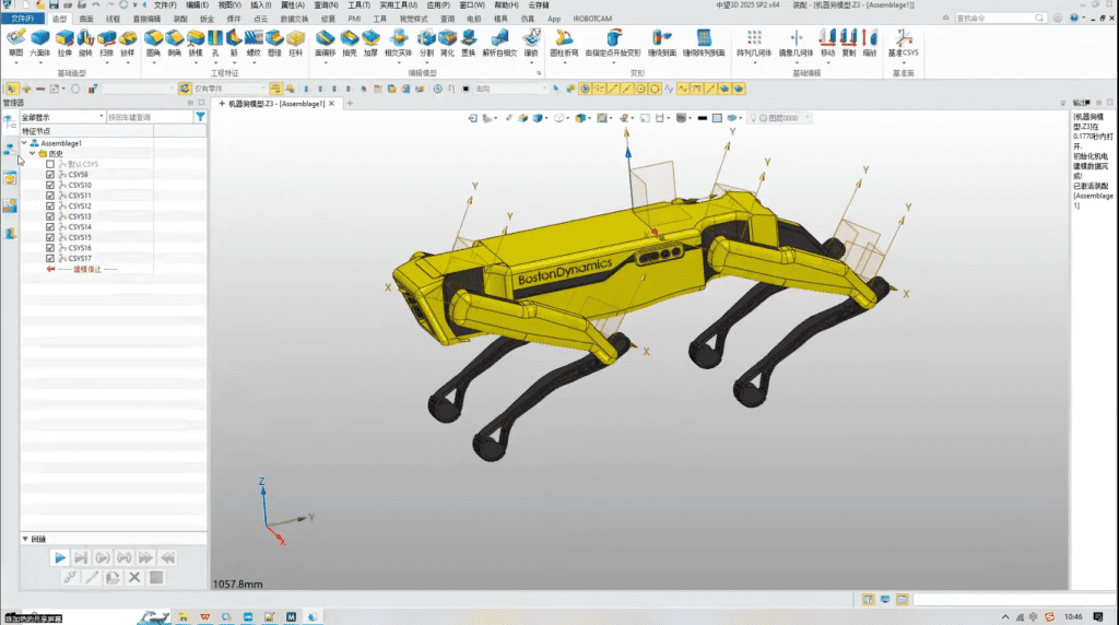1. iRobotCAM is based on a 3D geometry kernel technology architecture, which can import data formats from various 3D software, including Catia, Solidworks, NX, Creo, Inventor, etc. By importing robot dog files from Solidworks or Step using multiple files, a 3D structural diagram of a quadruped robot can be created in iRobotCAM.